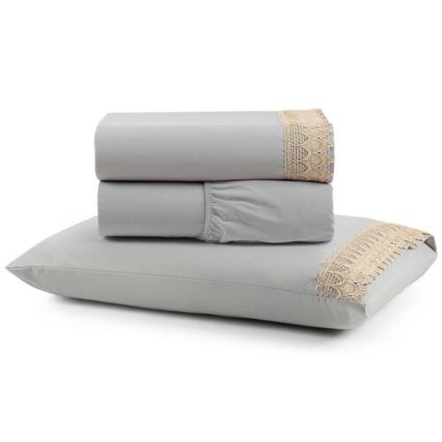 Jogo Cama Lençol Haia Solteiro Percal 200 Fios 100% Algodão Guipir Bordado Inglês 3 Peças - Cinza - Única