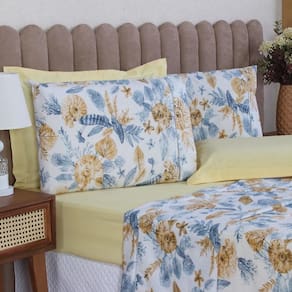 Contém na embalagem: 1 lençol liso com elástico 1,98m x 1,58m x 30cm 1 lençol estampado sem elástico 2,45m x 2,40m 2 fronhas estampadas com ponto palito 70cm x 50cm