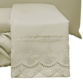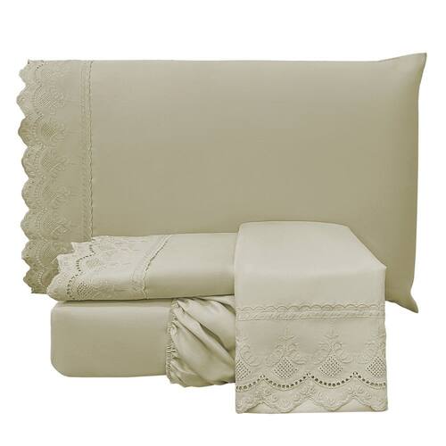Jogo Cama Queen Angely Bordado Inglês 4 pçs Bege