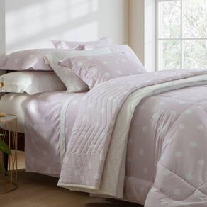 Com um padrão de poá em um suave tom de rose, esse jogo de cama traz um contraste elegante sobre o fundo claro, criando uma atmosfera de tranquilidade e charme para o seu quarto. Confeccionado em 100% algodão e 200 fios, oferece maciez e conforto, ideal para noites de sono reparadoras.