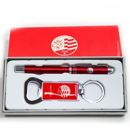 Estiloso jogo de caneta roller ball de metal com chaveiro abridor de garrafa, ambos toda customizada do Náutico. A parte superior da caneta pode ser usada para escrever em tablet ou smartphone.