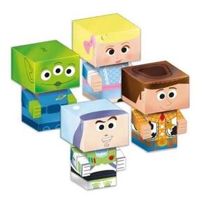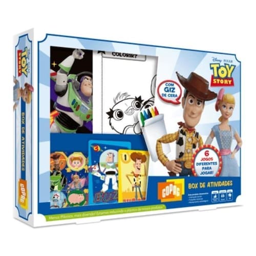 Com mini jogo, o box inclui, lâminas com atividades variadas, uma caixa de giz, uma cartela de adesivos, pôster e 4 paper toys dos personagens de Toy Story.