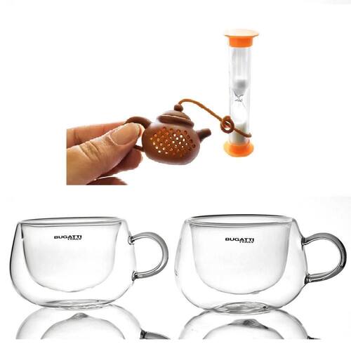 Imagine o charme de ter um infusor de chá que vem com um timer de areia A linha Gourmet da Prana desenvolveu essa combinação para dar uma alternativa para quem aprecia um chá perfeito, com o tempo médio ideal de infusão 3 minutos .Timer estilo ampulheta com marcação de tempo por areia. Infusor em formato de bule, um charme O Conjunto com 2 Xícaras de Chá com Alça 200ml da Bugatti é exclusivo, singular e elegante. Produzido em Vidro Borossilicato soprado, com parede dupla, é muito mais resistente. Apropriado para bebidas frias e quentes, podendo ser igualmente utilizado para cafés e chás. O Vidro Borossilicato é um tipo de vidro que contém Trióxido de Boro que permite um coeficiente de expansão térmica muito baixo. Especificações do Infusor: Altura: 5cm bule ; 9cm timer Diâmetro: 4cm bule ; 2cm timer Peso: 35g Material: Infusor em Silicone livre de BPA; Timer feito em vidro + ABS + PVC Marca: Prana Especificações das Xícaras: Altura: 7cm Diâmetro: 10cm Capacidade: 200ml Peso: 119g Material: Vidro Borossilicato Marca: Bugatti Garantia de 12 meses Ean: 7894131756379