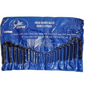 Kit Chave Allen com 25 Peças Hexagonal Sextavada Profissional Guepar Kit Chave Allen com 25 Peças Hexagonal Sextavada Guepar. 1 Bolsa + 24 Chaves Allen com Medidas em Milímetros Polegadas. - Marca: Guepar - Referência: 861-42922 - 24 Chaves Allen com Medidas em Milimetros e Polegadas - Fabricado em Aço Carbono Forjado - Ótima Resistência - Indicado para apertar ou soltar parafusos com sextavados internos - 12 Chaves Allen Sistema Métrico: 1mm, 1.5mm, 2mm, 2.5mm, 3mm, 3.5mm, 4mm, 5mm, 5.5mm, 6mm, 7mm, 8mm e 10mm - 12 Chaves Allen Sistema Inglês: 1/20, 1/16, 5/64, 3/32, 7/64, 1/8, 5/32, 3/16, 7/32, 1/4, 5/16 e 3/8 - 1 Bolsa plástica para Transporte - Peso: 500 gramas - : 90 dias Marca: Não Informado
