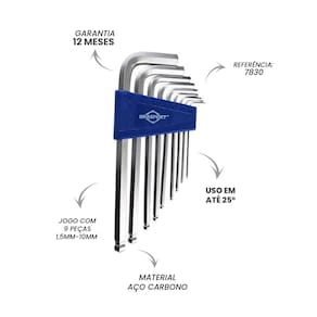 O Jogo de Chave Allen Abaulada 9 Peças Brasfort 7830 é ideal para quem busca qualidade, precisão e versatilidade em uma única solução. Composto por 9 peças que variam de 1,5mm a 10mm, este conjunto é indicado para apertos e desapertos em locais de difícil acesso, graças ao seu design abaulado, que permite o uso em ângulos de até 25°.