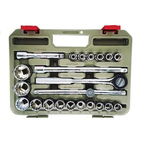 - Jogo chave catraca com soquete 23 peças Mayle. - Fabricado em cromo-vanádio. - Acabamento polido para fácil limpeza. - Estojo organizador em termoplástico e berço com identificação de medidas. - 2 Nichos para guardar objetos. - Visor transparente para fácil visualização das ferramentas. - 1 chave catraca reversível de 1/2" com 25 cm comprimento. - 1 Cabo de força 1/2" com 25 cm. - 1 extensão de 1/2" com 25cm. - 1 extensão de 1/2" com 12 cm. - 18 soquetes sextavados: 8, 9, 10, 11, 12, 13, 14, 15, 16, 17, 18, 19, 21, 22, 24 , 27, 30, 32mm.