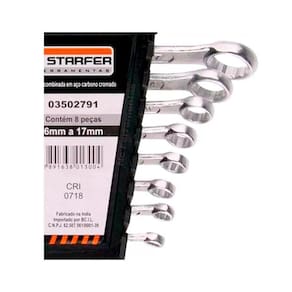 Descrição Jogo chave combinada boca estrela 6 a 17mm resistente 8 pcs é indicada para apertar e afrouxar parafusos ou porcas com perfil quadrado ou sextavado. Para perfeito funcionamento é importante usar a chave de tamanho compatível com a cabeça da porca ou parafuso. Detalhes 01 jogo de chave combinada cromo vanádio 6- 17 mm starfer Tamanho das chaves: 6, 7, 8, 9, 10, 11, 14, 17mm Especificações Com essa chave, o portador tem o melhor das duas chaves: fixa e combinada, carregando duas ferramentas em apenas uma. Características Proporciona maior praticidade, pois com apenas um jogo de ferramentas é possível realizar diversos trabalhos.As imagens são meramente ilustrativas Marca: Não Informado