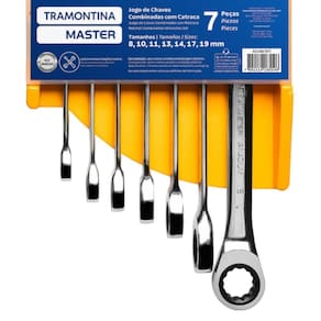 Jogo Chave Combinada Com Catraca 8 A 19Mm Com 7Pçs Tramontina Produto: Jogo de chave combinada com catraca 8 a 19 mm com 7 peças Marca: Tramontina Descrição: O Jogo de Chave Combinada com Catraca Tramontina é a escolha perfeita para quem procura eficiência e precisão em suas tarefas de montagem e manutenção. Ideal para ajustes em estruturas metálicas e instalações hidráulicas, este conjunto foi projetado para profissionais que buscam qualidade e durabilidade. Produzido em aço cromo vanádio, conhecido por sua alta resistência ao desgaste, o jogo de chave combinada é forjado e temperado, garantindo máxima durabilidade e longevidade. Características: • Material de Alta Qualidade: Aço cromo vanádio garantindo resistência e durabilidade. • Catraca de Alta Precisão: 72 dentes para um ajuste mais fino e eficiente. • Acabamento Cromado: Protege as ferramentas contra corrosão e aumenta a vida útil. • Versatilidade: Tamanhos de 8 a 19 mm, ideais para diversos tipos de parafusos. • Conformidade com DIN 3113: Atesta a qualidade e a conformidade com padrões internacionais. Com o Jogo de Chave Combinada com Catraca Tramontina, você não apenas compra um produto, mas um investimento em eficiência. A mecânica da catraca fosfatizada e a cabeça usinada completam o conjunto, tornando-o indispensável para trabalhos mecânicos e hidráulicos. Adquira já o seu e sinta a diferença de trabalhar com ferramentas de pontaEspecificações: Material: Aço cromo vanádioAcabamento: CromadoMedidas das chaves: 8, 10, 11, 13, 14, 17 e 19 mmNúmero de dentes da catraca: 72 dentes.Itens Inclusos: Acompanha o jogo: 7 chaves combinadas 8, 10, 11, 13, 14, 17 e 19 mm .