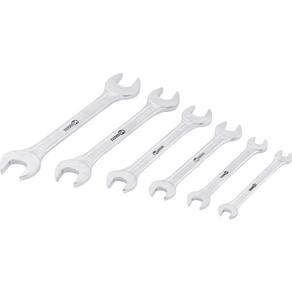 Jogo Chave Fixa 6-17mm Aço Carbono Com 6 Peças Estojo Plásti Conteúdo da embalagem 1 Jogo de chaves fixas composto por um estojo plástico com 6 peças, sendo: 6 mm x 7mm, 8mm x 9 mm, 10 mm x 11 mm, 12 mm x 13 mm, 14 mm x 15 mm e 16 mm x 17 mm Aplicações e dicas de uso Indicado para apertar e soltar porcas e parafusos sextavados. Nunca utilizar prolongadores sobre as chaves, pois isso aumentará o torque aplicado e diminuirá a vida útil da ferramenta. Uso leve. Destaques e diferenciais Corpo das chaves com acabamento cromado fosco, proporcionando maior resistência contra oxidação/corrosão. Possui pontas estreitas que possibilitam o uso em locais de difícil acesso. DETALHES TÉCNICOS
