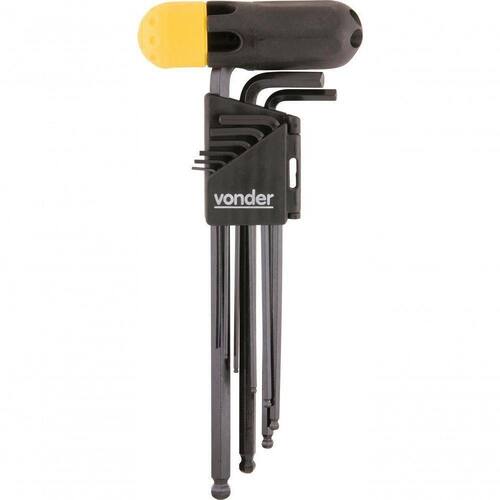 1 Jogo de chaves allen composto por um suporte plástico com 10 peças, sendo: 1,5 mm, 2 mm- 2,5 mm, 3 mm, 4 mm, 5 mm, 6 mm, 8 mm e 10 mm e 1 cabo plástico adaptador