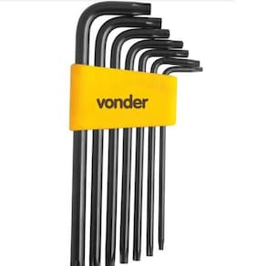 Descrição Chave torx jogo com 7 pçs t10 a t40 vtx-5 cod. 35.73.010.040 vonder 1 jogo de chaves hexalobular, composto por um suporte plástico com 7 peças, sendo: t10 - t15 - t20 - t25 - t27 - t30 e t40 Indicado para fixar e soltar parafusos hexalobular Produzido em aço cromo vanádio, proporcionando maior resistência e durabilidade. Possui ainda furo guia, que confere encaixe perfeito em parafusos que tenham este guia. Pode ser utilizada normalmente também em parafusos que não tenham este guia. Material do corpo da chave: aço cromo vanádio Acabamento da chave: fosfatizado preto Ean: 7893946084226