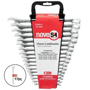 1 Jogo de chaves combinadass, composto por um suporte plástico com 17 peças, sendo: 6,0 mm, 7,0 mm, 8,0 mm, 9,0 mm, 10,0 mm, 11,0 mm, 12,0 mm, 13,0 mm, 14,0 mm, 15,0 mm, 16,0 mm, 17,0 mm, 18,0 mm, 19,0 mm, 20,0 mm, 21,0 mm e 22,0 mm.