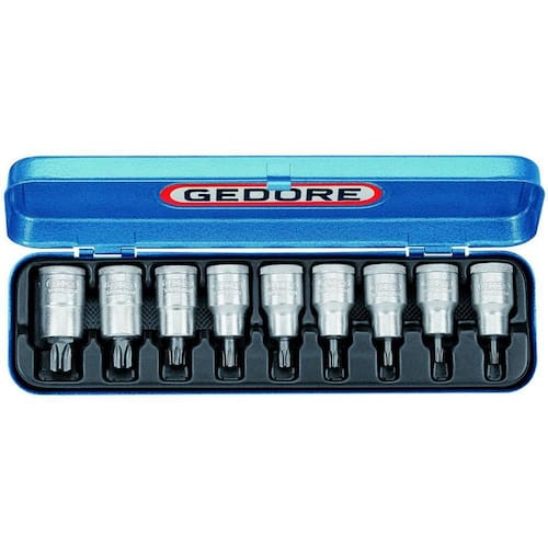 Fornecido em estojo metálico com pintura eletrostática. Soquetes Aço Gedore-Vanadium. Zincado e ponta endurecida. Para trabalhar com acessórios manuais com encaixe 1/2, conforme DIN 3120 - C 12.5, ISO 1174. Indicado para parafusos perfil Torx. Modelo longo.