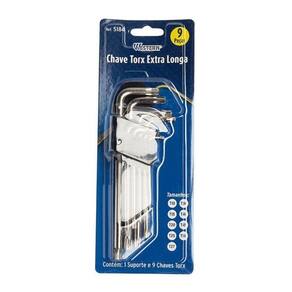 Jogo Chaves Torx Longa C/ 9 Peças Domine o aperto preciso com este conjunto de 9 chaves Torx Longas. Forjado em aço carbono e revestido com níquel, ele oferece resistência e alta durabilidade para enfrentar qualquer tarefa. Com sua ferramenta em mãos, você terá o poder de controlar o torque aplicado nos parafusos e porcas, garantindo um aperto seguro e sem riscos de danos. O acabamento niquelado não somente confere um visual profissional, como também protege o material contra ferrugem e corrosão, mantendo a chave em perfeita condição por muito mais tempo. O suporte, em preto, proporciona organização e praticidade para conservar suas chaves sempre à mão e evitar perdas.