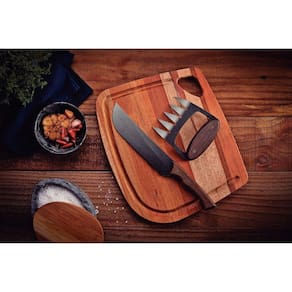Lâminas de aço inox escurecido. Resistentes e robustas.Cabos de madeira com design anatômico que tornam o uso muito mais confortável.Rebites em aço inox escurecido.Tabua para facas de madeira