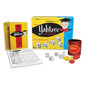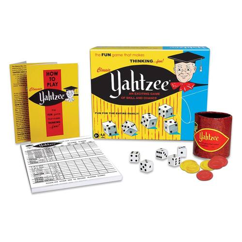 Yahtzee clássico com arte retrô, um emocionante jogo de habilidade e azar com componentes autênticos, da Winning Moves Games USA, para maiores de 8 anos, 2 ou mais jogadores (1167) - FAVORITO DE TODOS OS TEMPOS DA FAMÍLIA: Classic Yahtzee é o jogo de dados mais vendido e famoso de todos os tempos. Famílias e amigos apreciam esse ícone americano desde os fabulosos anos 50! - O CONTEXTO: A sorte desempenha um grande papel em Yahtzee, mas a estratégia faz uma grande diferença. Você marca cada combinação apenas uma vez, e o número de combinações diferentes que você pode marcar é igual ao número de turnos no jogo. - O JOGO: Lance todos os 5 dados no seu turno. Se você não gostar do que jogou, pode guardar qualquer quantidade de dados e rolar o resto até mais 2 vezes! - RITMO RÁPIDO: O jogo termina após cada jogador ter 13 turnos e preencher todas as caixas da coluna com uma pontuação ou zero. O jogador ou equipe com a maior pontuação total em todos os jogos (até seis) vence! - QUAIS SÃO AS CHANCES? : Você sabia que as chances de lançar um “Yahtzee” (5 OF A KIND) em sua primeira jogada são de 1295 para 1? Então você não verá isso acontecer com muita frequência! - Copo de dados com borda de alumínio, cinco dados brancos, bloco de notas, oito fichas de bônus (4 vermelhas, 4 amarelas), bandeja de armazenamento, folha de instruções - Introduzida há mais de cinquenta anos