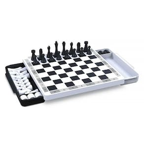 2 em 1, jogos clássicos são uma jornada divertida para explorar suas próprias estratégias e tomar decisões. O tabuleiro vem com gavetas para que possa guardar as peças e leva onde for.