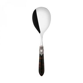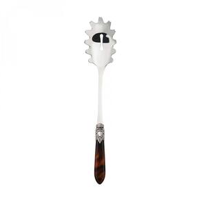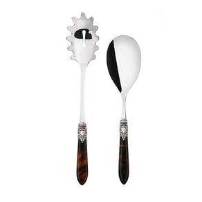 Para garantir uma mesa elegante e com espírito régio o jogo de colher grande para servir e pegador de massa da linha Oxford da Bugatti foi produzido em aço inox 18/10, com cabo de madrepérola em acrílico enriquecido por um sofisticado anel com acabamento em prata antiga que lembra um nobre brasão.