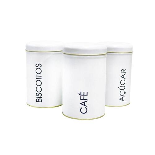 Produto com design moderno e exclusivo com opção de armazenamento de 03 mantimentos descritos em cada lata sendo açúcar, café e biscoitos.