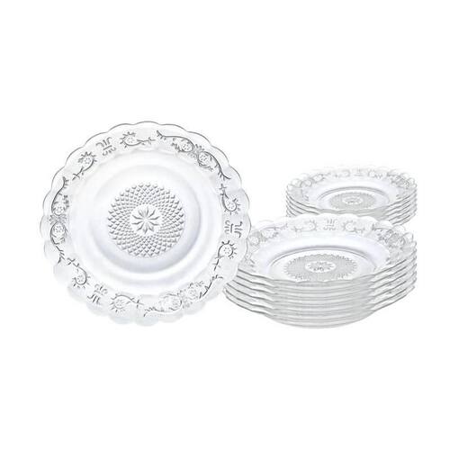 Jogo com 12 Pratos Fundo de Vidro Premium Transparente Jogo com Pratos Fundo de Vidro Transparente Alta Qualidade ===================================== Produzidos em vidro transparente de alta resistência, os pratos apresentam um design clássico e refinado, com detalhes decorativos em relevo, bordas delicadamente trabalhadas e um acabamento que valoriza a beleza dos alimentos, destacando sobremesas, massas, saladas, carnes, acompanhamentos e muito mais.