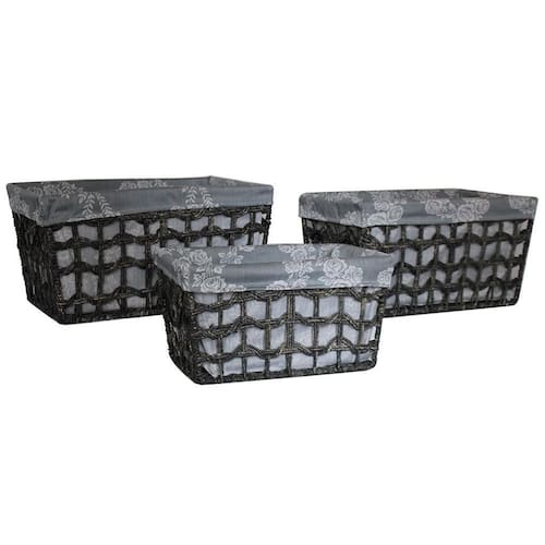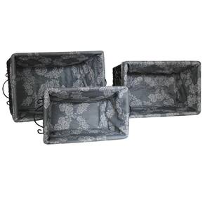 Especificações: - Produto: Jogo com 3 cestos nos tamanhos P, M e G com forro estampado demais elementos presentes nas fotos são meramente ilustrativos - Código: 1494 - Cor: Cinza Por ser um produto com matéria prima e tingimento natural e processo de montagem artesanal, é possível que haja variação na cor de cada peça - Tamanhos: P - 42x26x23cm M - 47x31x25cm G - 53x36x28cm - Material: Cesto - Estrutura em ferro trançado com fibra natural Alça - Metal Forro - Tecido em algodão
