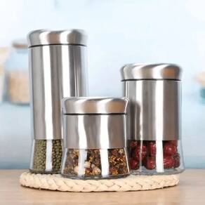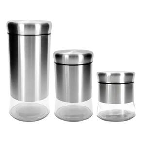 Material: Aço inoxidável e vidro resistente Quantidade: 3 potes de diferentes tamanhos Tampa com vedação hermética para melhor conservação Design moderno e elegante para compor sua cozinha Uso: Ideal para armazenar grãos, massas, biscoitos, café, açúcar e outros mantimentos