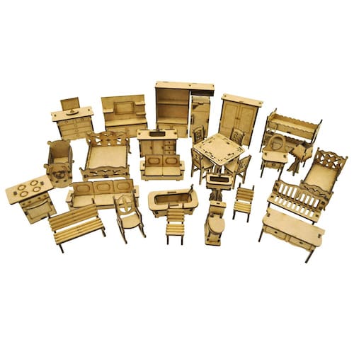 Jogo com 30 Móveis para Casa de Boneca - Miniatura 3D - Madeira MDF Jogo com 30 móveis miniatura 3D para casas de brinquedos geralmente Utilizado em casa de boneca . Comumente utilizado para mobilia de casas miniatura ou maquetes de brinquedo. Podem ser utilizados também como peças decorativas para quaisquer ambientes. Medidas: AlturaxLarguraxComprimento cm Vaso Sanitario 3D Miniatura Laser = 5x2x4 Guarda Roupas 3D Miniatura = 9x2,5x7,5 Cama de Solteiro 3D Miniatura = 5x5x8,5 Cama de Casal 3D Miniatura = 5x7,5x8,5 Banco Descanso 3D Miniatura = 4,5x3x7 Sofá 3 Lugares 3D Miniatura = 4x2,5x10 Cadeira 3D Miniatura = 6x3x3 Abajur 3D Miniatura = 6x2,5x2,5 Penteadeira 3D Miniatura = 7,5x3x4 Televisão 3D Miniatura = 3x1x3 Berço 3D Miniatura = 5x3,5x6,5 Cômoda 3D Miniatura = 6x3x7 Banheira 3D Miniatura = 4x4x7 Mesa 3d Miniatura = 5x6,5x6,5 Fogão 3D Miniatura = 5x3,5x5,5 Pia Lavabo 3D Miniatura = 6x2,5x4 Geladeira 3D Miniatura = 7,5x3,5x3,5 Estante Com TV 3D Miniatura = 7,5x2,5x8 Pia com Armário 3D Miniatura = 5,5x3x7 Armário para Cozinha = 10x3x10,5 Aparador Reto 3D Miniatura = 4,5x3x7,5 Sofá 2 Lugares 3D Miniatura = 4x2,5x7,5 Beliche 3D Miniatura = 7,5x5x8,5 Banco de Praça 3D Miniatura = 4,5x3,5x6 Cadeira de Praça 3D Miniatura = 4,5x2,5x3,5