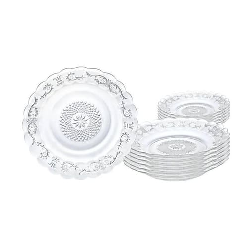 Jogo com 48 Pratos Fundo de Vidro Premium Transparente Jogo com Pratos Fundo de Vidro Transparente Alta Qualidade ===================================== Produzidos em vidro transparente de alta resistência, os pratos apresentam um design clássico e refinado, com detalhes decorativos em relevo, bordas delicadamente trabalhadas e um acabamento que valoriza a beleza dos alimentos, destacando sobremesas, massas, saladas, carnes, acompanhamentos e muito mais.