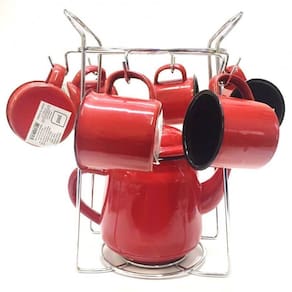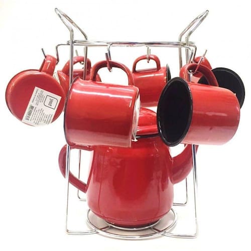 Lindo jogo esmaltado com suporte para 6 xícaras e base para o Bule. Todos os itens já inclusos, aproveite esta oferta! A tradicional mini caneca para café com Bule Esmaltado da Yazi dará um charme à sua mesa! O Kit contém: -01 Bule: 23,4cm x 17,3cm x 13cm 1700ml Aço Esmaltado-06 Caneca: 9cm x 6cm x 7cm 150ml Caneca: Aço Esmaltado-01 Suporte Aramado p/ 6 Xícarás de café e base p/ pires ou Bule