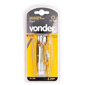 Jogo Com 8 Peças De Chaves Hexagonais Allen Ca 150 Vonder O jogo de chaves hexagonais é indicado para apertar e soltar parafusos com sextavado interno - Marca: Vonder - Modelo: CA 150 - Quantidade: 8 peças - Material: aço cromo vanádio - Suporte em alumínio - Acabamento da Chave: Niquelado - Tipo da ponta da chave allen: Hexagonal - sendo: 1.5, 2.0, 2.5, 3.0, 4.0, 5.0, 6.0 e 8.0mm - Peso: 0,96Kg - : 90 dias