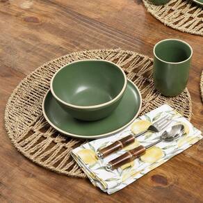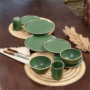 Jogo Copa E Cia 16 Peças Vivant Em Cerâmica Verde Jogo Copa e Cia 16 Peças Vivant em Cerâmica Verde - Características Gerais do Produto: - Composição: 100% Cerâmica. - Detalhes: Cerâmica com Efeito Mate (Fosco).; Design Exclusivo Copa&Cia.; As cores podem sofrer pequenas alterações de cor, variando de monitor para monitor.; Os objetos que ambientam as fotos não acompanham o produto.; As fotos produzidas são apenas como sugestão de uso com as demais peças da coleção.; Produzido na Tunísia - Cuidados: Lavar com Detergente Neutro e Esponja Macia.; Não Deixar de Molho.; Podem ser Colocados em Lava-Louças e Micro-Ondas.; Não utilizar solventes, abrasivos ou alvejantes. - Dimensões (cm): Bowl : 15cm ; Caneca: Capacidade para 300ml; Prato Raso: 27cm ; Prato de Lanche: 20cm Acompanha o produto: - 4 Pratos Rasos4 Pratos de Sobremesa4 Bowls4 Canecas Garantia: - Sem Garantia