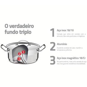 - Economiza tempo e energia: o segredo está no fundo triplo (aço inox + alumínio + aço inox), que distribui o calor uniformemente, proporcionando um cozimento mais rápido. Por isso, você pode manter o fogo baixo durante todo o preparo e, assim, poupar energia;