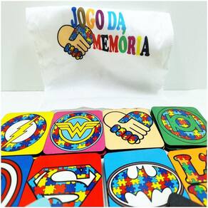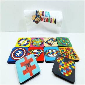 Apresentamos o Jogo da Memória Heróis para Autistas como opção de presente super diferenciado, ele é todo colorido e vem com 10 pares feitos em MDF 3 mm e personalizados artesanalmente pelo processo de sublimação, o tamanho das peças é de 6 x 6 cm. A personalização é feita somente de 1 lado. Acompanha saquinho para guardar as peças.