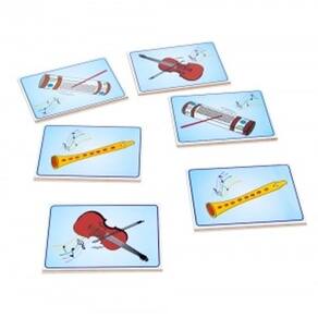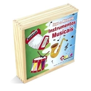Confeccionada em M.D.F. Jogo formado por peças com figuras de instrumentos melódicos e de percussão em um dos lados.