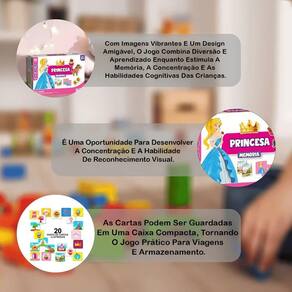 Jogo Da Memória Princesas - Pais E Filhos O Princesa Memória da marca Pais e Filhos é um jogo encantador que traz um toque de magia ao aprendizado das crianças. Com o tema de princesas, o jogo é uma ótima maneira de estimular a memória e o raciocínio lógico dos pequenos, enquanto se divertem com ilustrações encantadoras. A cada rodada, as crianças viram as cartas e tentam encontrar os pares correspondentes, desafiando sua memória de forma envolvente. É uma atividade perfeita para pais e filhos brincarem juntos, criando momentos de interação e aprendizado. Além de melhorar a memória, o jogo também ajuda a desenvolver a concentração e a paciência. O Princesa Memória torna o aprendizado mais divertido e especial, com a magia das princesas transformando o jogo em uma experiência ainda mais divertida! Código: 102897 Dimensões aprox. da embalagem em cm: 5x22x23 Peso liq. Aproximado do produto na embalagem: 164g Certificado Inmetro:003754/2019 Referência do modelo: 2824 Conteúdo da embalagem: 20 Pares De Peças Ilustradas. Composição/material: Papel . Idade recomendada: a partir de 4 anos Garantia: 90 dias contra de fabricação pelo fabricante. Imagens meramente ilustrativas. As cores e tonalidades podem variar. Gênero - Meninas Idade - 4 anos 5 anos 6 anos Tipo - Puzzle Quantidade de Peças - Até 60 Peças Ean: 7896647028247