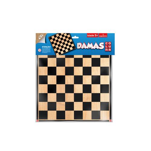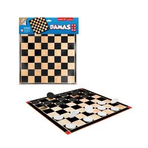 Feita em MDF resistente com tabuleiro reversível tipo solapa que se dobra para armazenar as peças coloridas (geralmente 24 pretas e 24 brancas), segue as regras tradicionais: peças movem diagonalmente para frente e capturam saltando adversários, promovendo dama ao chegar na última fileira.