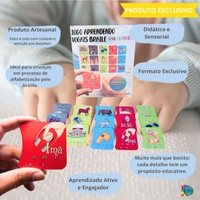 Descubra o Jogo das Vogais em Braile, uma ferramenta didática e sensorial essencial para crianças em processo de alfabetização pelo braille. Este produto artesanal, cuidadosamente feito à mão, proporciona uma experiência única de aprendizado tátil, estimulando o reconhecimento das vogais por meio de palavras ilustradas e escrita em braille com strass. Seu formato exclusivo torna o ensino mais envolvente e acessível, promovendo um aprendizado ativo que conecta emoção e conhecimento. Ideal para educadores e famílias que buscam inclusão e desenvolvimento cognitivo, este jogo é mais que um brinquedo: é uma ponte para o mundo da leitura para crianças com deficiência visual. Conquiste resultados reais com esta metodologia comprovada, que alia diversão e educação de forma inovadora e eficaz.