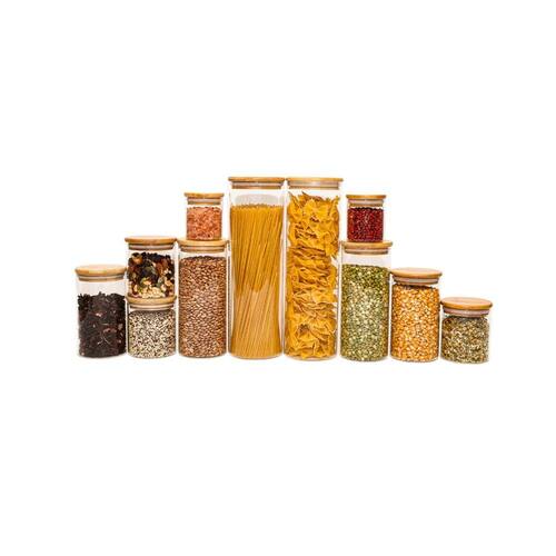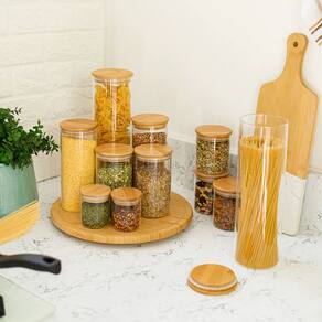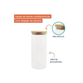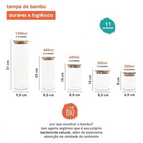 Características: Conjunto com 11 potes em 5 tamanhos funcionais; Vedação hermética com anel de silicone; Tampas de bambu planas e seladas, resistentes à umidade; Vidro borossilicato resistente a choques térmicos; Design transparente para fácil visualização do conteúdo; Versáteis para alimentos, mantimentos e decoração;