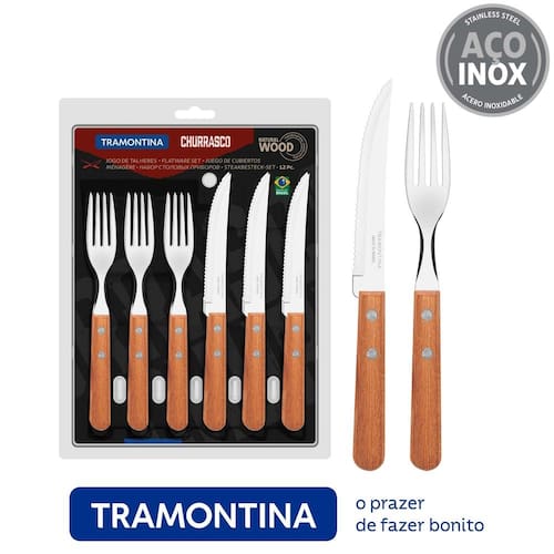 O jogo de talheres Tramontina churrasco com lâminas em aço inox e cabos de madeira natural 12 peças é a escolha perfeita para garantir durabilidade e conforto para os encontros.