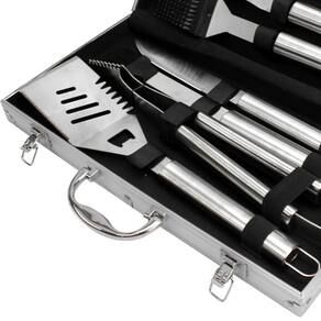 A maleta em alumínio proporciona além da organização das peças, o requinte que todo bom churrasqueiro merece.