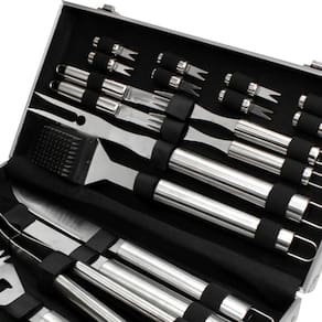 Confira nosso Jogo de 19 Peças para Churrasco Gourmet em Aço Inox com Maleta de Alumínio da Fracalanza que vai elevar o patamar das suas tardes de churrasco!