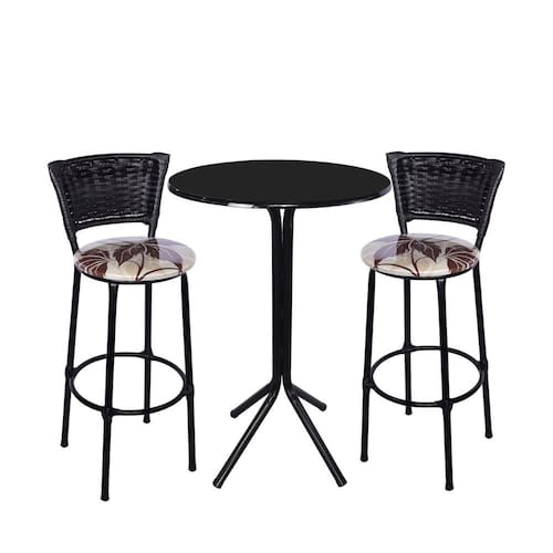 Jogo de 2 Banquetas Preta Junco Preto Assento Floral Marrom com Bistro Preto e PretoSeja para acompanhar um café rápido no início do dia ou aquela confraternização especial com os amigos, a Banqueta Alta com Encosto e a Mesa Bistrô serão grandes aliados na composição do seu espaço. Conjunto ideal para completar sua sala de jantar, espaço de churrasqueira ou até mesmo em seu estabelecimento comercial.Com design sofisticado que conta com cor sóbria, as peças embelezam o seu espaço ao mesmo tempo que garante a comodidade ideal, afinal, as banquetas possuem o assento preenchido em espuma recebe superbem o corpo além do suporte para os pés.Características da Banqueta com EncostoCor da estrutura: Preta Cor do Assento: Floral MarromCapacidade (kg): 120 kgMaterial da estrutura: Tubos de Aço carbono (7/8 de polegada)Material do assento: MDF e EspumaMedidas da Banqueta Alta com Encosto Altura do assento até o chão (cm): 72 CmAltura do encosto até o chão (cm): 95 CmDiâmetro do assento: 32 CmCaracterísticas da Mesa BistrôCor Estrutura: PretoCor Tampão: PretoMaterial Bistrô: Tubo 1 e 1/8Material do Tampo: MDF 15mmAcabamento Mesa: Pintura Epóxi em PóAcabamento Tampo: Pintura UVMontagem: Encaixe simples e parafusos no tampoMedidas da Mesa BistrôAltura Total do Produto: 80cmDiâmetro da Tampa: 60cmEspessura da Tampa: 15mmPeso Máximo Recomendado sob o Produto: 15 kg Conteúdo da Embalagem: 2 Banquetas e 1 Mesa BistrôDicasNão deixe suas banquetas e bistrô expostos ao sol por mais de 4 horas.Não use produtos abrasivos na limpeza.Usar um pano umedecido na limpeza e, logo em seguida, seque-as com um pano seco.A tonalidade da cor pode variar de acordo com o lote do fabricante e/ou as configurações de seu monitor.*Imagens meramente ilustrativasGarantia3 Meses contra defeito de fabricação