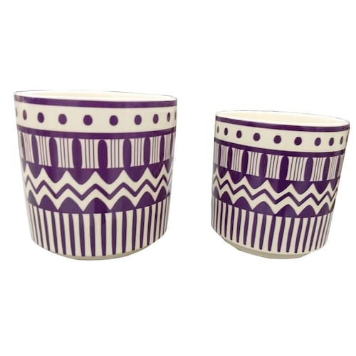 A embalagem contem 1 Jogo de 2 Floreiros de Cerâmica Roxo/Branco 15/13cm. Marca: Fujian Dehua