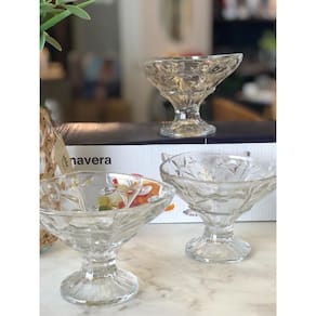 Contem 3 taças para sobremesa em vidro decorado em alto relevo; Altura: 9,5cm Diametro: 13cm Capacidade: 300ml Criada no início da década de 90 a Dynasty nasceu como uma marca inovadora de produtos para a cozinha, bar e vinho, e mesa posta. Conhecida pela qualidade, variedade e beleza, a marca se consagrou nos lares brasileiros e se tornou uma das mais importantes em houseware do país. Moderna, descolada e confiável.