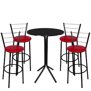 Jogo de 4 Banquetas Preta Assento Vermelho com Bistro Preto e PretoSeja para acompanhar um café rápido no início do dia ou aquela confraternização especial com os amigos, a Banqueta Alta com Encosto e a Mesa Bistrô serão grandes aliados na composição do seu espaço. Conjunto ideal para completar sua sala de jantar, espaço de churrasqueira ou até mesmo em seu estabelecimento comercial.Com design sofisticado que conta com cor sóbria, as peças embelezam o seu espaço ao mesmo tempo que garante a comodidade ideal, afinal, as banquetas possuem o assento preenchido em espuma recebe superbem o corpo além do suporte para os pés.Características da Banqueta com EncostoCor da estrutura: Preta Cor do Assento: VermelhoCapacidade (kg): 120 kgMaterial da estrutura: Tubos de Aço carbono (7/8 de polegada)Material do assento: MDF e EspumaMedidas da Banqueta Alta com Encosto Altura do assento até o chão (cm): 72 CmAltura do encosto até o chão (cm): 95 CmDiâmetro do assento: 32 CmCaracterísticas da Mesa BistrôCor Estrutura: PretoCor Tampão: PretoMaterial Bistrô: Tubo 1 e 1/8Material do Tampo: MDF 15mmAcabamento Mesa: Pintura Epóxi em PóAcabamento Tampo: Pintura UVMontagem: Encaixe simples e parafusos no tampoMedidas da Mesa BistrôAltura Total do Produto: 80cmDiâmetro da Tampa: 60cmEspessura da Tampa: 15mmPeso Máximo Recomendado sob o Produto: 15 kg Conteúdo da Embalagem: 4 Banquetas e 1 Mesa BistrôDicasNão deixe suas banquetas e bistrô expostos ao sol por mais de 4 horas.Não use produtos abrasivos na limpeza.Usar um pano umedecido na limpeza e, logo em seguida, seque-as com um pano seco.A tonalidade da cor pode variar de acordo com o lote do fabricante e/ou as configurações de seu monitor.*Imagens meramente ilustrativasGarantia3 Meses contra defeito de fabricação