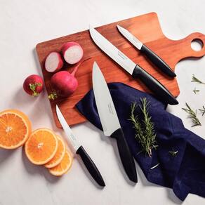 O jogo de facas Tramontina Plenus preto 04 peças será seu ajudante perfeito na hora de preparar suas refeições, sejam elas com carnes, legumes ou frutas. Perfeito para uso diário, ele é composto por facas desenvolvidas com lâminas em aço inox com tratamento térmico e devido a isso, garantem um excelente fio de corte. Os cabos são em polipropileno na cor preta, são resistentes e duráveis, podendo ainda, ir à máquina de lavar louças. Escolha Tramontina e deixe seu dia a dia na cozinha muito mais prático!