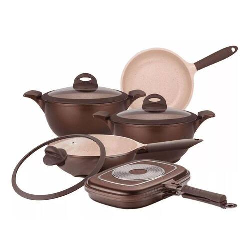 Revestimento cerâmico Cerâmic-Flon MTA Pode ser levada diretamente ao fogão a gás, elétrico e de indução e também a geladeira e lava-louças Frigideira com cabos de acabamento Soft Touch emborrachados Caçarolas com alças removíveis Material em alumínio injetado de 4,5 mm de espessura Comporta lava louças Comporta geladeira.