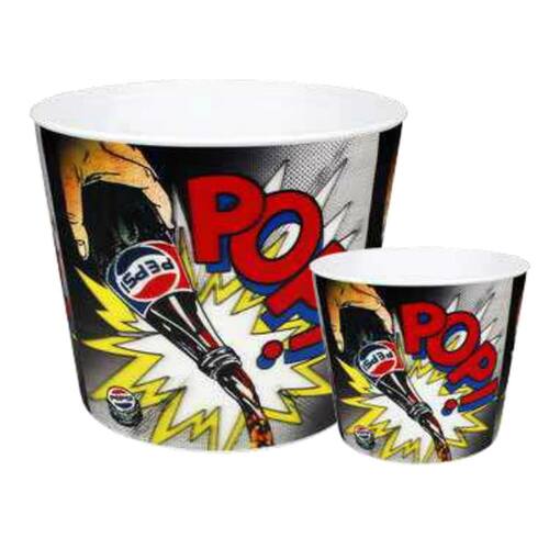 Faça da sua casa um verdadeiro cinema e sirva pipocas nesses lindos e divertidos baldes da Pepsi Cola. Desfrute de ótimos momentos com esse prático e moderno balde para pipocas da Pepsi Cola. Contém: 1 Balde grande 20,5 cm de diâmetro por 17 cm de altura e 4 baldes pequenos de 12,8 cm de diâmetro por 12 cm de altura.