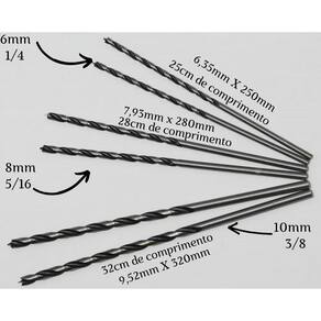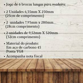 Jogo com 6 Brocas Mourão com qualidade de ponta a preço PROMOCIONAL por tempo limitado, garanta já o seu Novo lote de brocas de 3 pontas para madeira são desenvolvidas exclusivamente para furos em madeira sólida e compostos derivados. Feitas em aço carbono 45 de alta resistência com sua afiação exclusiva, garantem um melhor acabamento, alto poder de corte e grande durabilidade. 2 unidades de 6,35mm X 259mm 25cm comprimento 2 unidades de 7,93mm x 280mm 28cm comprimento 2 unidades de 9,52mm X 320mm 32cm comprimento Informações Adicionais Verifique o sentido de rotação Nunca exceda a RPM máximo e utilize as brocas somente em materiais de madeira. Excesso de rotação e avanço de corte podem comprometer a qualidade do furo e inutilizar as brocas Atenção, sempre utilize equipamento de EPI's no manuseio de equipamentos que possam oferecer algum tipo de risco a sua segurança. Para a HeMi Commerce a sua satisfação é muito importante, qualquer dúvida sobre o produto e compra estamos à disposição. do vendedor: 30 dias Marca: Não Informado Ean: 79012580384074