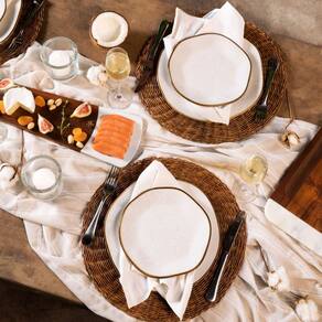 Descrição: Jogo De 6 Pratos Rasos Oxford Ryo Maresia 27,5cm Branco e Marrom. Inspirado no conceito japonês wabi-sabi, esta coleção valoriza a beleza do irregular e do imperfeito. Com estética que remete às praias, areia e frescor do mar, cada peça possui aplicação manual de esmalte e filete reagente, garantindo singularidade. Produzido em porcelana, é compatível com micro-ondas e máquina de lavar louças.